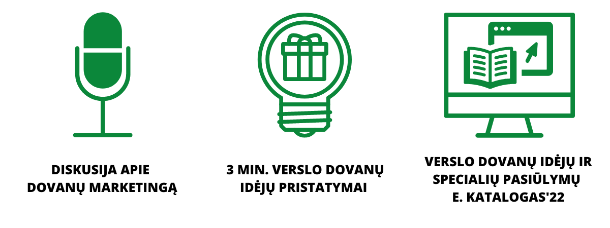 Renginio metu dalyviai išgirs 16-os prekių ir paslaugų įmonių 3 min. trukmės verslo dovanų idėjų pristatymus: