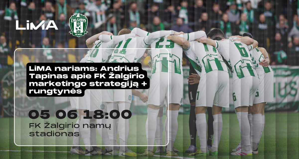 Gegužės 6 d. 18 val. - super ambicinga legendinio Vilniaus FK „Žalgirio“ klubo marketingo strategija su LiMA nariais pasidalins Andrius Tapinas, klubo prezidentas. Sužinosite ir bendradarbiavimo galimybes.
